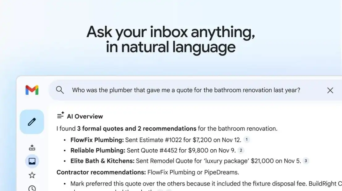 – AI Overviews để tìm kiếm email: Trước đây, mọi người có thể tìm kiếm email bằng cách nhập các từ khóa như “thợ sửa ống nước” vào thanh tìm kiếm. Giờ đây, người dùng có thể nhập một câu hỏi vào thanh tìm kiếm, chẳng hạn như “Tên của người thợ sửa ống nước đã sửa bồn cầu cho tôi năm ngoái là gì?”. Tính năng này sẽ đặc biệt tiện dụng cho những người có hộp thư quá tải, vì cách tìm kiếm từ khóa “thợ sửa ống nước” kiểu cũ có thể hiện ra rất nhiều email không liên quan.